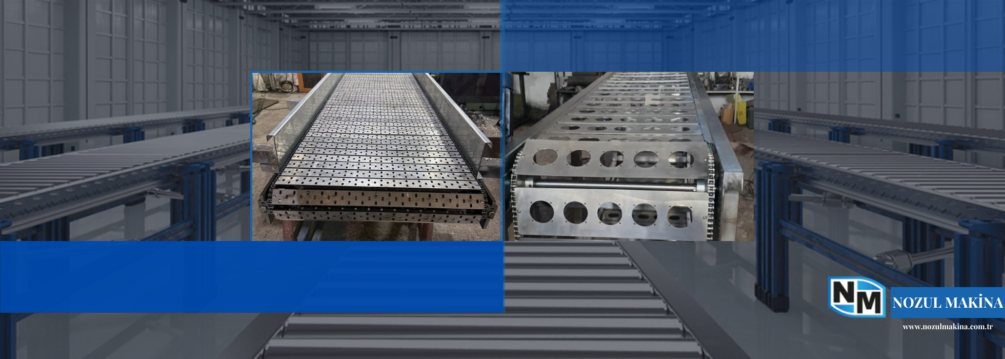 Chain conveyors operate with motor power and chains. The conveyor moves thanks to the chains circulating along its length. Chains are connected to the product via rollers, buckets, caps, or directly with hooks, enabling the transportation process. Chain conveyors can be manufactured to suit any industry.